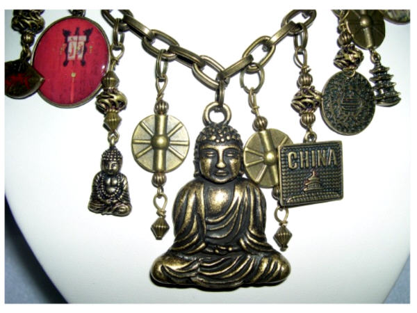 Antiqued brass buddhas, temples, red coral pieces and other Asian inspired charms dangle from this necklace. Base metal. Lobster clasp. 2" centerpiece buddha charm. 24"L .... SOLD OUT