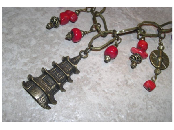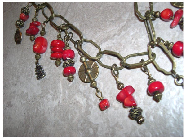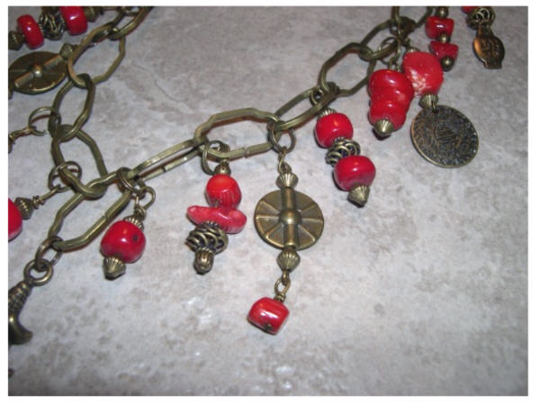 Antique gold and coral blend well together on this necklace. It is loaded with genuine coral beads and temple charms. 24"L