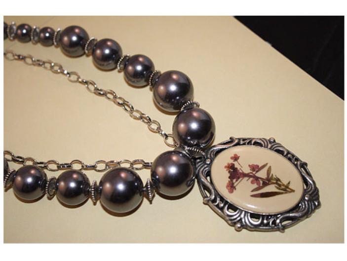 A 2" floral epoxy pendant hangs from this silvertone double strand necklace. The large glass silver pearl beads give it a vintage feel. 24" Long