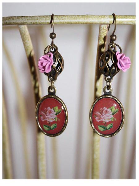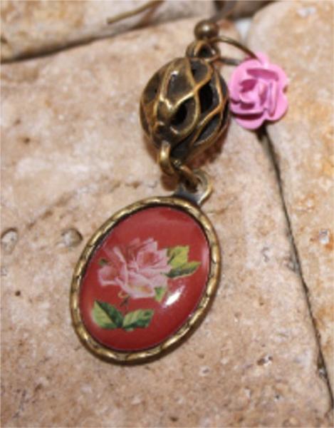 Dainty enameled rose charm sit atop vintage looking epoxy rose charm on these earrings. Antique goldtone. 2" Long